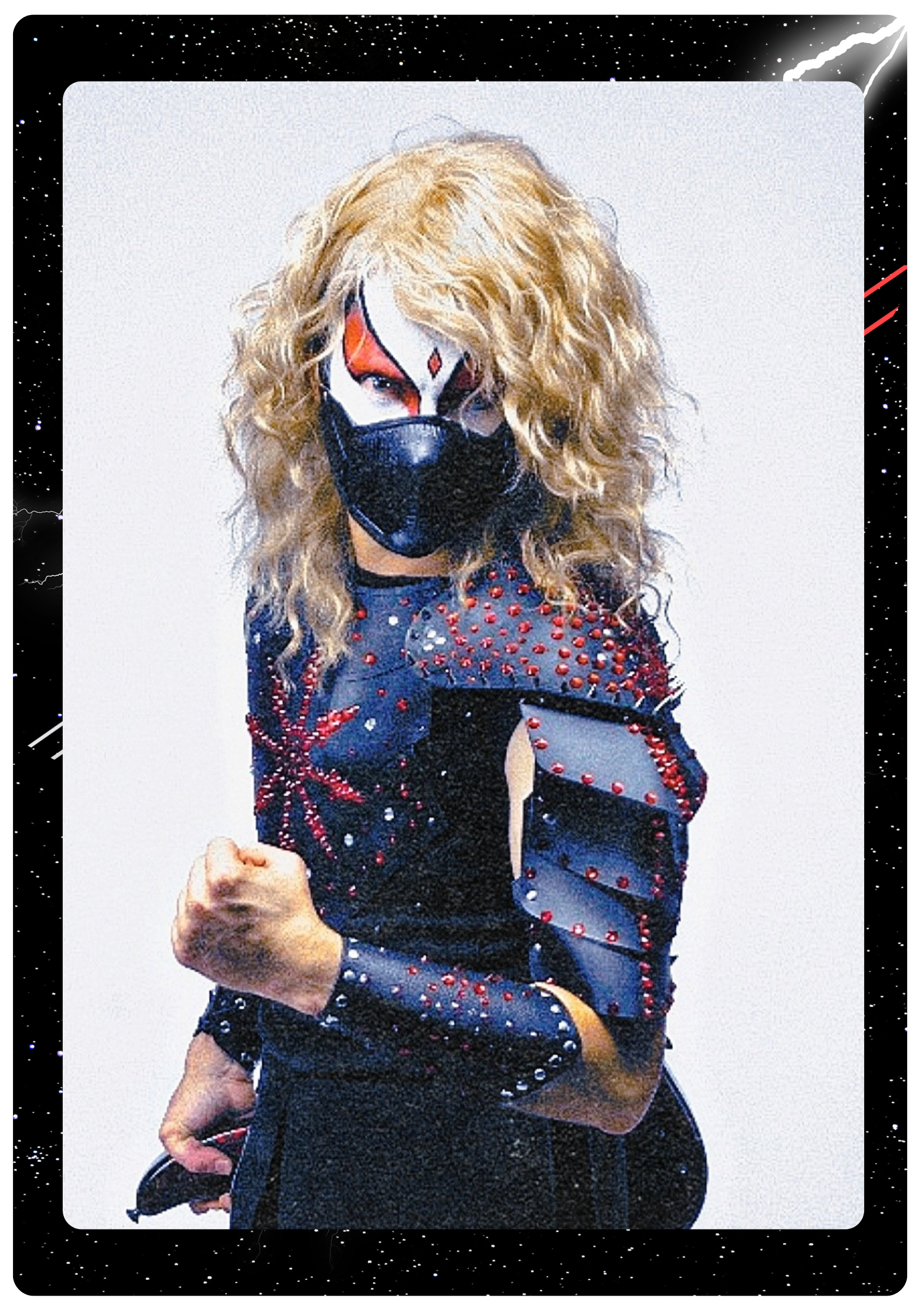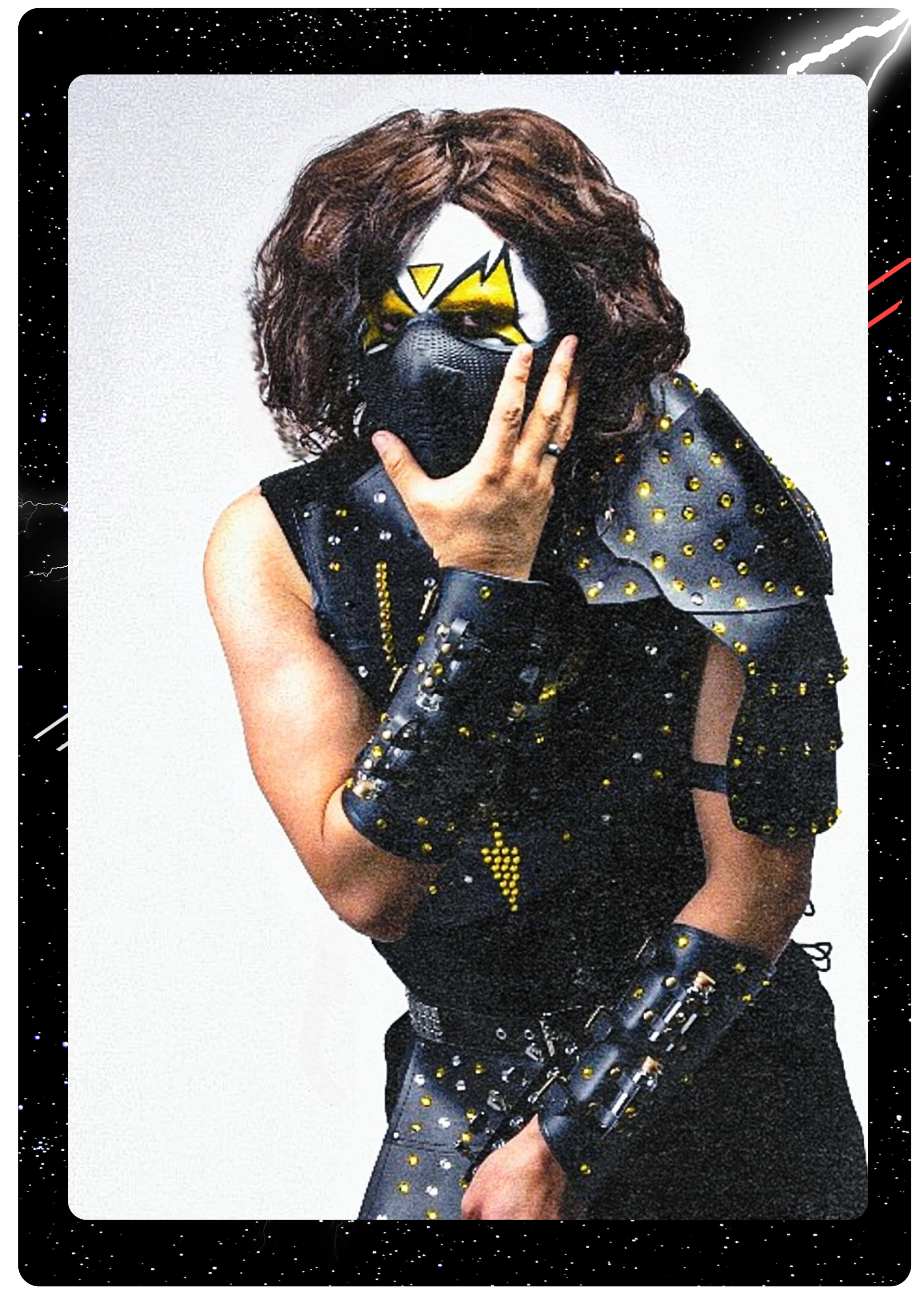 Forged in the primordial chaos of the universe, ARMAGELION is the embodiment of raw power, rebellion, unyielding spirit and the masked force of rock n' roll. His arrival is heralded by meteoric storms and the roaring echoes of celestial guitars. Adorned in cosmic armor glimmering with stardust, ARMAGELION wields the Trident of Eternity, a weapon forged in the heart of a dying star, capable of summoning sonic waves that shatter worlds and awaken dormant souls. A towering figure cloaked in an aura of electrifying energy, ARMAGELION’s voice is a thunderous declaration of glory, destruction and defiance. His purpose transcends mere music— He is a cosmic liberator, using the unrelenting power of rock to challenge oppression, inspire rebellion, and ignite the hearts of all who dare to dream.